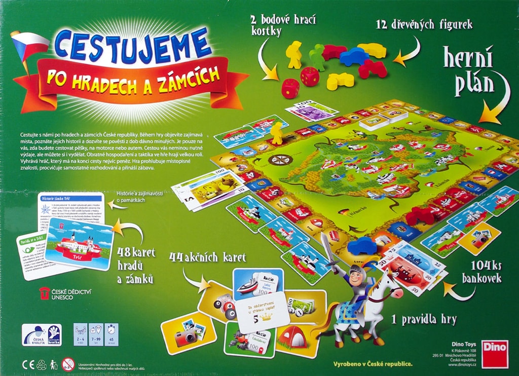 Cestujeme po hradech a zámcích je rodinná hra na principu klasických her s tržním mechanismem obchodu, házení kostkami a sestavování kolekcí karet jako u Monopoly či Dostihů & Sázek. Chybí však jakékoliv blafování, sázení a škození soupeři. Jedná se ryze českou hru, ale bohužel jméno autora ani kreslíře se mi nepodařilo vypátrat. Přece jen jde už o starší kousek vydaný firmou DINO TOYS, s.r.o. v roce 2011 a tenkrát se na hru ilustrátoři ani autoři ještě nepsali. Byla vyhotovena ve dvou verzích – s mapou České republiky pro Čechy a mapou Slovenské republiky pro Slováky. V recenzi si projdeme jen verzi s ČR (dále Česko). Jak už sám název napovídá: potulujete se svou rodnou krajinou, ať už pěšky, na motorce nebo autem, a snažíte se navštívit nejznámější hrady a zámky (ve hře jich je celkem 12). Jedná se rozhodně o graficky lepší předělávku hry než tehdy vydanou firmou Tofa Semily v roce 1980, která měla stejný název i herní systém, ale po letech došlo k oprášení a zjednodušení pravidel.