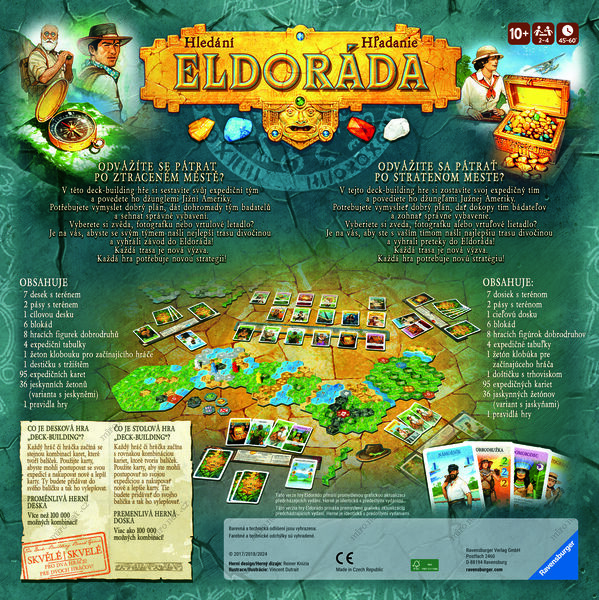 Hledání Eldoráda je desková hra pro 2 až 4 hráče, kteří představují členy expediční výpravy v Jižní Americe. Spolu s ostatními se vydávají na dobrodružnou výpravu do džungle, kde hledají legendární zlaté město. Tato dobrodružná hra byla nominována na titul Hračka roku 2020 a tuto prestižní nominaci také získala, což jí umožňuje pyšně se nazývat vítězem. Mimochodem, tato hra je mezinárodní verzí původní hry, kterou společnost Ravensburger uvedla na trh již v roce 2017. Hra byla vytvořena renomovaným herním designérem Reinerem Kniziem, který již vydal více než 200 her a získal mnoho ocenění. Na této hře spolupracoval společně s Vincentem Dutraitem, který se postaral o grafickou stránku celé hry. Hra kombinuje prvky deck-buildingu a strategického plánování s dobrodružným tématem, což vytváří dynamický a poutavý zážitek pro hráče všech věkových kategorií.