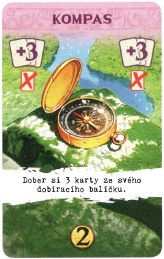 - Kompas: Umožňuje vám vzít 3 karty, ale poté se odstraní z hry.