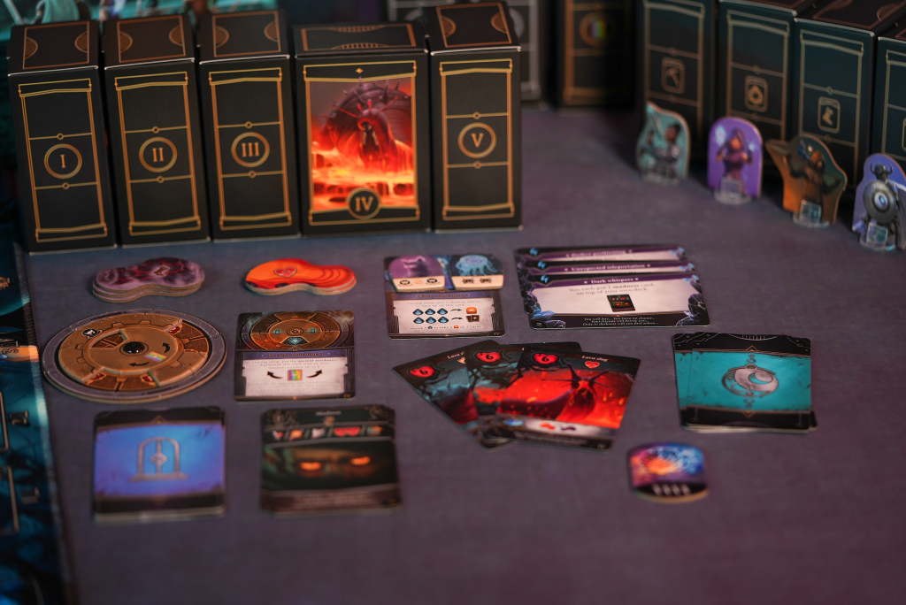 Herní karty, zahrnující předměty, kouzla a další herní prvky, jsou také součástí balení a dodávají hře další vrstvu strategie. Hra obsahuje také 20 žetonů prachu a 20 žetonů duchů, které hráči používají během hry. Kartonové figurky hrdinů jsou detailně malované a dodávají hře vizuální atraktivitu.