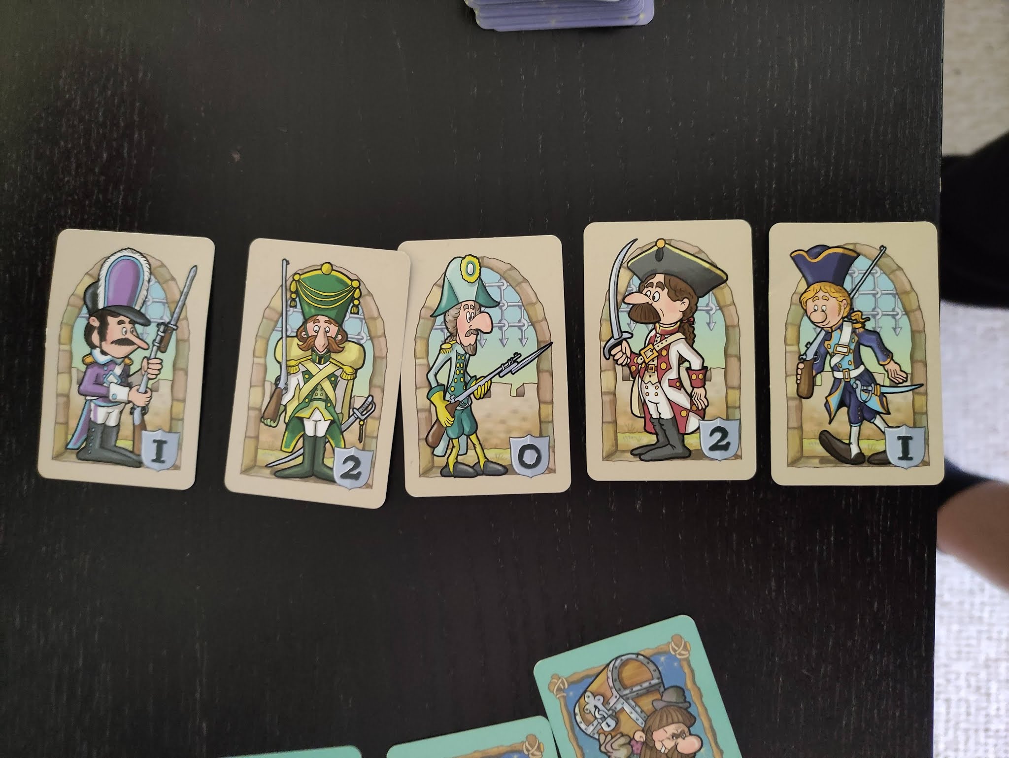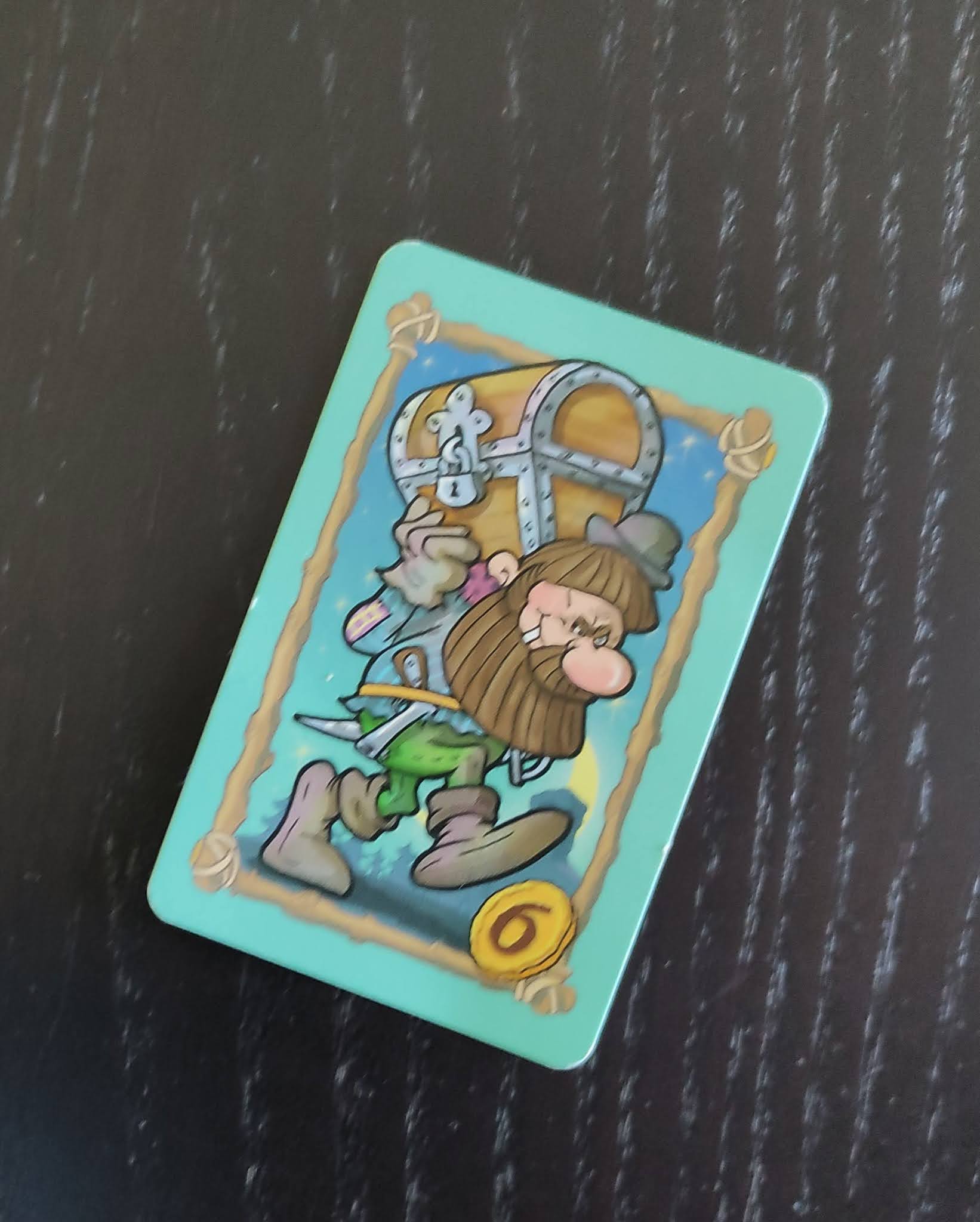 A co je ten poklad? Poklad je jedna z karet loupežníků, respektive jeden z nich – ten vousatý co nese na zádech truhlu. Jeho číselná úroveň je taky jedna z nejvyšších ve hře (5), takže není žádná sranda jej chytit a porazit (otočení vojáka + hod kostkou). Vzhledem k tomu, že Kuba ještě neumí moc pořádně počítat, hrajeme Loupežníci, třeste se! zatím bez matematiky. Takže jen chodíme po plánu a sbíráme loupežníky na červených polích.